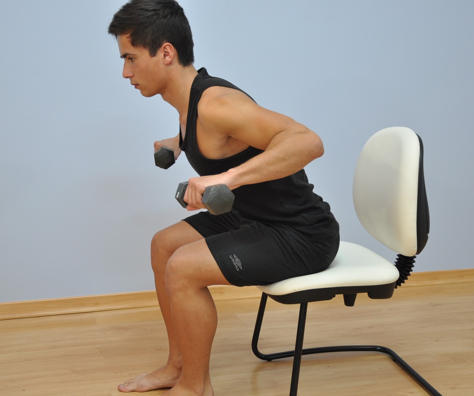Sentado, com o tronco inclinado à frente. Puxe os cotovelos para trás