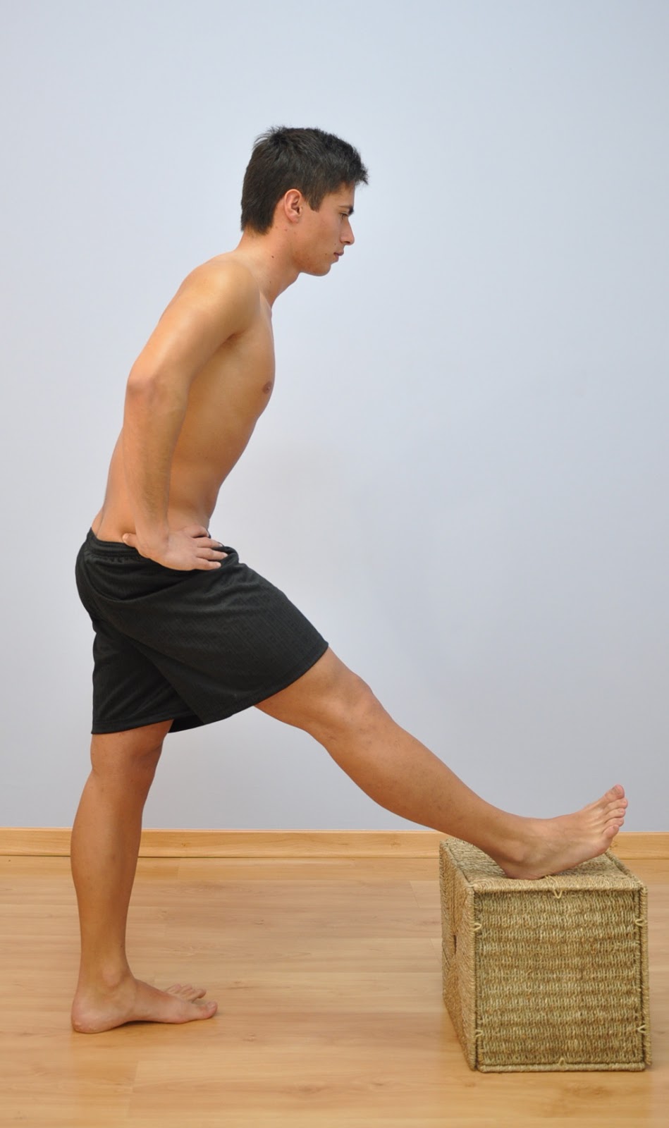 calcanhar apoiado numa mesa e as costas alinhadas. Faça pressão sobre o joelho