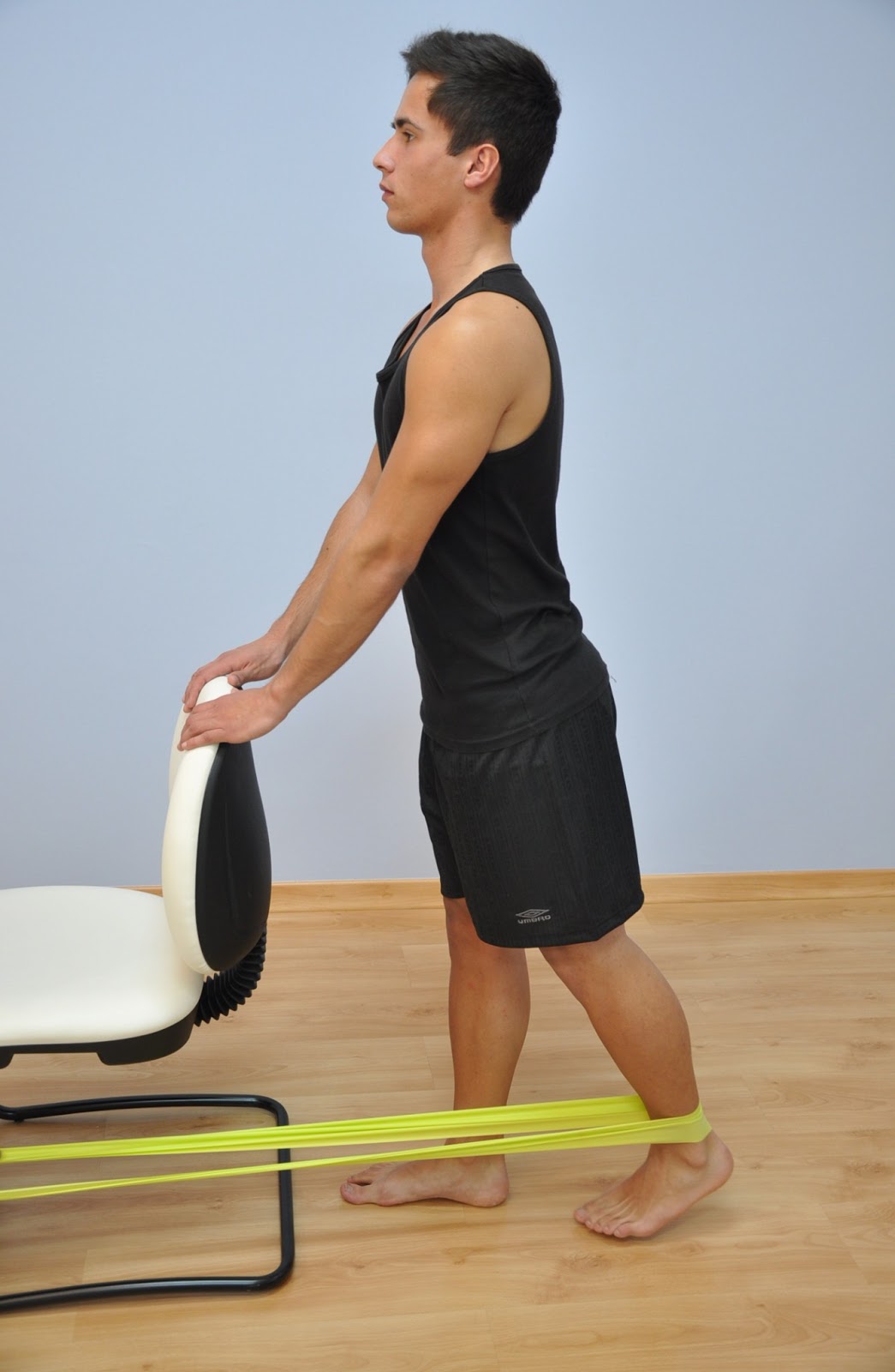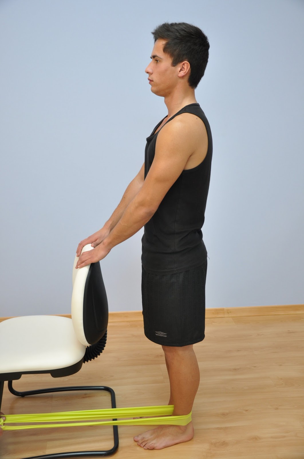 apoiado numa cadeira, com um elástico à volta do tornozelo. Com a perna