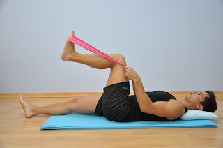 elástico na ponta do pé, com a coxa e joelho dobrados a 90o.