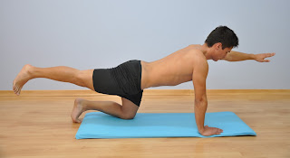 a perna do lado contrário. Mantenha perna, coluna e braços alinhados. Retorne